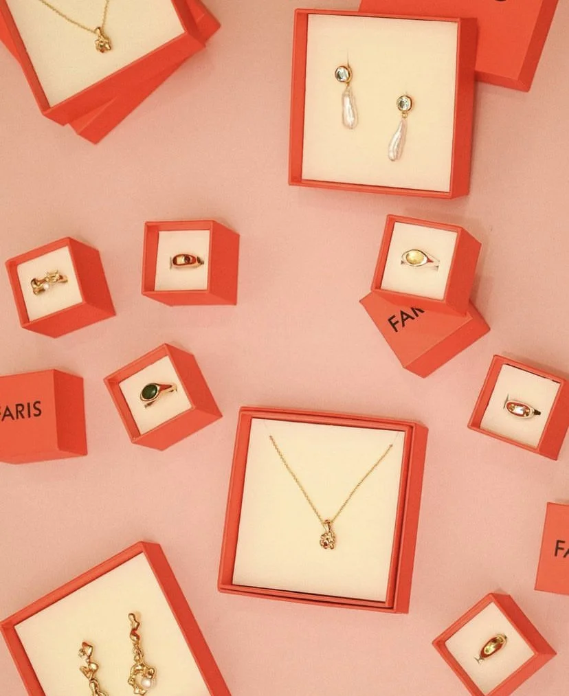 Shot 3: BREDA & JBW Packaging alternating and stacked as a tower on pink (Hand write MEGHANI Holiday 2023 on corner of paper)